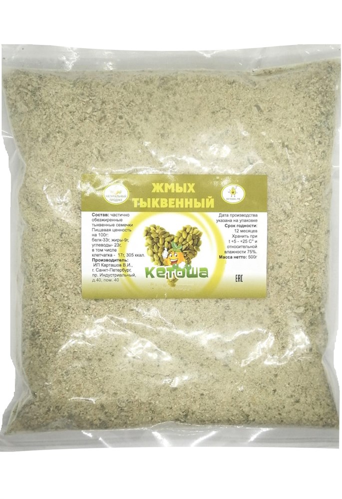 Тыквенный жмых получают при дроблении ядер семечек тыквы в процессе отжима масла. Жмых имеет легкий масляный запах и цвет, варьирующийся в диапазоне от желтого до коричневого. В его составе целый комплекс витаминов, минералов и высочайшая концентрация растительного белка не менее 40 %